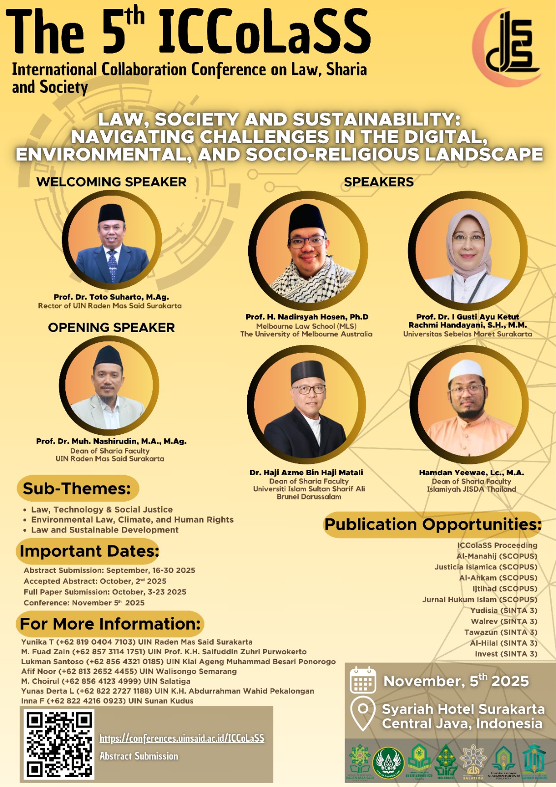 Hosted by the Faculty of Sharia at Universitas Islam Negeri Raden Mas Said Surakarta, the International Conference on Law, Society, and Sustainability (ICColaSS) 2025 is convened under the vital theme, "Law, Society and Sustainability: Navigating Challenges in the Digital, Environmental, and Socio-Religious Landscape." This conference aims to foster a critical and interdisciplinary dialogue on the complex intersections where legal systems confront the most pressing contemporary issues. It seeks to explore how legal frameworks must evolve to address the ethical and regulatory dilemmas of the digital age, respond to the urgent call for environmental justice and sustainable development amidst a climate crisis, and navigate the dynamic and often sensitive relationship between state law and diverse socio-religious norms. By bringing together scholars, practitioners, and policymakers, ICColaSS 2025 endeavors to chart innovative pathways and formulate robust solutions that promote justice, resilience, and sustainability across these multifaceted and interconnected domains.
